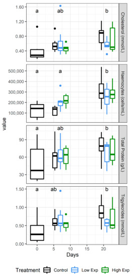 J. edwardsii haemolymph parameters that changed significantly over the course of the experiment in control (black), low (blue), and high (red) algal exposure treatments (0, 1 × 105, 2 × 105 A. catenella cells/L, respectively). Days which are not significantly different from each other share the same letter.