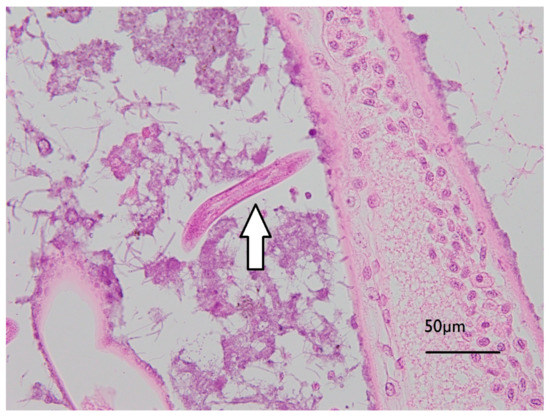 Micrograph of J. edwardsii gill filament with biofouling (mixed bacterial colonies, including Leucothrix-like organisms, adhered to filaments) and a free-living nematode between filaments as indicated by the arrow.