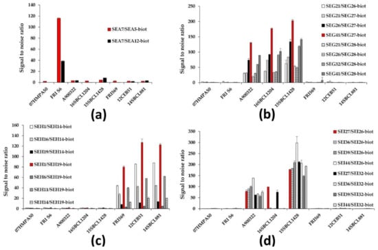 Concerning SEA detection, two mAb pairs stood out among all the combinations, involving SEA7 as capture antibody, with biotinylated SEA5 or SEA12 as tracer. The selected mAb pair (capture SEA7/biotinylated SEA5) showed better sensitivities in comparison to the second mAb pair for the detection of both recombinant and commercial SEA (Table 2), and most importantly, a three-fold better signal-to-noise ratio for the detection of native SEA from FRI S6 S. aureus strain supernatant without significant cross-reactivities with the other strains (Figure 1a).