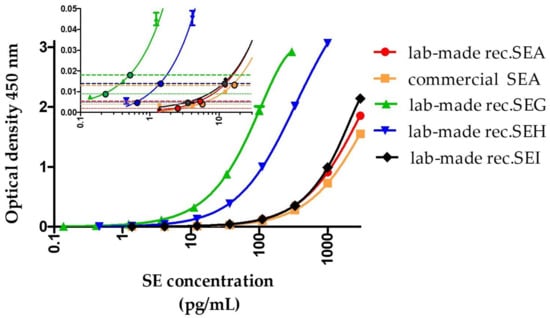 Lab-made recombinant enterotoxins SEA, SEG, SEH, or SEI were directly spiked at different concentrations in these buffered (pure, 2-, and 5-fold diluted) matrices. Then, 100 μL was transferred into the coated microtiter plates and analyzed as previously described.