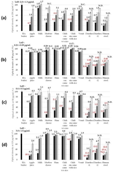 Robustness of the sandwich immunoassays in various complex matrices. Dilutions of target toxins, i.e., recombinant lab-made SEA at 250 pg/mL (a), SEG at 50 pg/mL (b), SEH at 50 pg/mL (c), and SEI at 333 pg/mL (d), were performed in EIA buffer (positive control reaching approximately 1 optical density (OD) signal), undiluted matrices (black bars), 2-fold diluted matrices in EIA buffer (dark gray bars), 5-fold diluted matrices in EIA buffer (clear gray bars), or 20-fold diluted matrices in EIA buffer (white bars). Undiluted liquid matrices consisted of raw matrices buffered by the addition of a one-tenth volume of 10X EIA buffer. Undiluted solid matrices consisted of 10% (W/V) ground homogenate prepared in water and buffered by the addition of a one-tenth volume of 10X EIA buffer. All these spiked samples were detected using the best-identified sandwich immunoassay (Table 3) using the 3-h sequential format with poly-horseradish peroxidase-labeled streptavidin detection. Results are expressed as a percentage of signal (optical density with subtraction of nonspecific binding) obtained when the target toxin is prepared in EIA buffer (black bar on the right side of each graph). Numbers located above the bars indicate the theoretical LoD (calculated as explained in methods) measured in the corresponding matrix and calculated from one experiment. Error bars represent standard deviations from two independent experiments. N.C., not calculable. N.D., not determined.