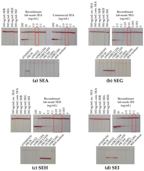 Multiplex immunochromatographic tests were produced in a pre-industrial format (strip plus cassette) by NG-Biotech (Guipry, France) using SEA7, SEB27, SEG41, SEH14, and SEI44 as immobilized capture mAbs on test lines, goat anti-mouse IgG antibodies as the control line, and SEA12, SEB26, SEG27, SEH19, and SEI32 as colloidal gold-labeled conjugate mAbs lyophilized on a single release zone. The assay was performed by dispensing 100 μL onto the cassette. Results were read by the naked eye after 30 min.