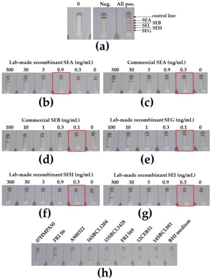 Detection of SEA, SEB, SEG, SEH, and SEI using multiplex immunochromatographic test after 30 min of migration. (a) Description of the manufactured multiplex cassette: 0, cassette before use; Neg., negative result; All pos., positive result for all enterotoxins (solution containing 3 ng/mL for each SEA, SEH, and SEI and 1 ng/mL for each SEB and SEG in ICT buffer). Serial dilutions with lab-made recombinant SEA in (b), commercial SEA (c), commercial SEB (d), lab-made recombinant SEG (e), SEH (f), or SEI (g) toxin were prepared in immunochromatographic (ICT) buffer before loading 100 μL onto the cassette. (h) BHI-cultured S. aureus supernatants were processed as described in the methods section before performing the test by loading 100 μL onto the cassette. The monoclonal antibody (mAb) pairs used in these manufactured (NG-Biotech, France) multiplex cassettes were the same as for the lab-made monoplex strips.
