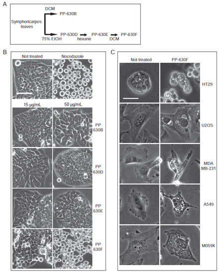 Extract PP-630B, which was more toxic than extract PP-630A, was oily and therefore difficult to weigh and solubilize reliably. We then prepared a sequential extraction of S. occidentalis leaves with 75% (v/v) ethanol/water (PP-360D) followed by 100% hexane (PP-630E) before a final extraction with 100% dichloromethane, giving rise to a non-oily extract PP-630F (Figure 3A). We then tested if PP-630F was still cytotoxic and induced the clear zone structures observed by PP-630A treatment. HT-29 cells were not treated, treated with nocodazole, or treated with 15 or 50 µg/mL of PP-630B, PP-630D, PP-630E, or PP-630F and observed by phase contrast microscopy. Nocodazole-treated cells showed a round phenotype (Figure 3B), whereas PP-630F-treated cells showed aberrant morphology at 50 µg/mL compared to extracts PP-630B, PP-630D, or PP-630E. Removal of ethanolic and hexane soluble chemicals did not diminish PP-630F capacity to induce clear zones in cells.