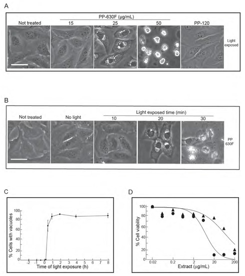 Vacuolation of cells is PP-630F concentration dependent and requires exposure to light. (A) U2OS cells were either not treated or treated with 15, 25 or 50 µg/mL of PP-630F and exposed to ambient light. In parallel, cells were treated under similar conditions with extract PP-120 (Thermopsis rhombifolia). Cells were imaged at 16 h by phase contrast microscopy. Scale bar = 50 µm. (B) U2OS cells were either not treated or treated with 25 µg/mL of PP-630F. Cells were then either kept in the dark (No light) or exposed to ambient light for 10, 20, or 30 min. Cells were imaged at 16 h by phase contrast microscopy. Scale bar = 50 µm. (C) U2OS cells were treated with PP-630F at Time 0. Cells were also exposed to ambient light at indicated times before or after extract treatment. Cells were imaged at 16 h after light exposure by phase contrast microscopy. The percentage of cells that had vacuoles in a treated sample were calculated from three experiments and standard errors of the means are shown. (D) U2OS cells were treated with increasing concentrations of PP-630F for 96 h and either exposed to ambient light (circles) or kept in the dark (triangles). The MTT assay was used to measure cell viability. Mean percentages of viability were calculated from three experiments and standard errors of the means are shown. The mean IC50 concentration of PP-630F was 8 ± 2 µg/mL and 26 ± 3 µg/mL with and without light, respectively.