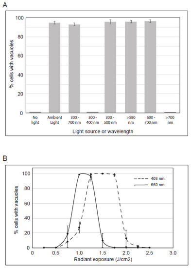 Characterization of the irradiation that induces vacuoles in cells treated with PP-630F. (A) U2OS cells were treated with PP-630F and not exposed to ambient light, exposed to ambient light, or exposed to ambient light filtered through optical glass of known transmission values. The light source and wavelengths (nm) are listed. The mean percentage of cells with vacuoles was calculated from three experiments and standard errors of the means are shown. (B) U2OS cells were treated with 25 µg/mL PP-630F and irradiated at increasing radiant exposures with LEDs at 408 nm (- - -) or 660 nm (—). The mean percentage of cells with vacuoles after each treatment was calculated at 16 h and standard errors of the means are shown.