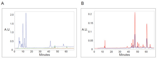 Analysis of PP-630 extracts by absorbance at various wavelengths. (A) PP-630F extracts were fractionated by HPLC C18 chromatography and absorbance (arbitrary units, A.U.) of eluted chemicals was monitored over time at wavelengths of 197 (blue), 410 (green), and 665 (red) nm. (B) PP-630F extracts were analyzed as described in A by higher absorbance sensitivity at 410 (green) and 665 (red) wavelengths. Note that the absorbance scale is different from that in A.