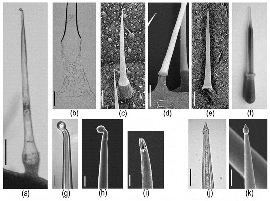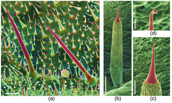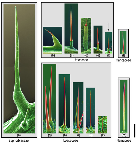 Stinging hairs are remarkably complex morphological features and their origin can best be understood by a comparison to non-stinging hairs and a study of their ontogeny. In most stinging-hair-bearing species, particularly Urticaceae, Loasaceae, and Cnidoscolus species, the stinging hairs differ considerably from non-stinging hairs, but may be connected to them by morphological intermediates. Unlike the morphologically homogeneous stinging hairs, the much smaller non-stinging hairs are often highly variable in size and morphology within and between species (Figure 7a–c) [31].