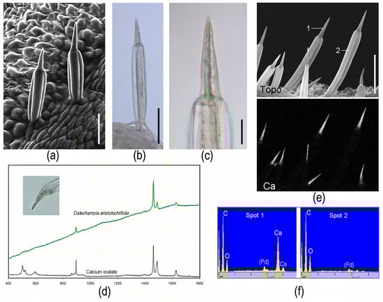 “Tragia-type” stinging hairs.—Stinging hairs of some Euphorbiaceae are strikingly different: Knoll (1905) [13] and Thurston (1976) [32] described the structure of the stinging emergence of Tragia (Plukenetieae) and Dalechampia (Dalechampieae). These are also structures made up of several cells, but with the actual stinging cell provided with an apically positioned, sharp-pointed, calcium oxalate crystal in the cell lumen (Figure 3a–c). Upon contact, the distal cell wall breaks and the crystal is ejected forcibly, together with the irritant fluid contained in the cell. This “stinging cell” emerges from a group of elongated jacket-cells. This unique type of “ballistic” stinging hair has so far only been reported from the two closely allied groups of Dalechampieae and Plukenetieae in Euphorbiaceae [33]. These are also clearly stinging hairs as defined above—acting to inject irritant fluid into the skin—but are both morphologically and functionally divergent from the other stinging hairs here considered. Our own recent analyses could confirm the composition of the stinging hair apex as calcium oxalate by Raman spectroscopy and energy dispersive X-ray (EDX) element analyses with an SEM (Figure 3); other parts of the hair and epidermis cells were found to be unmineralized.
