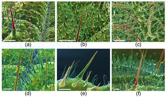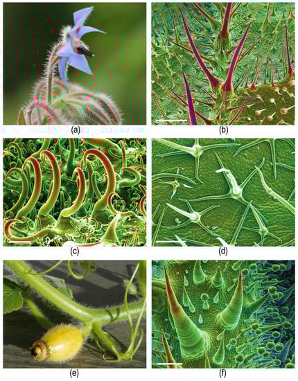 Irritant hairs, which do not inject a toxic fluid, may act mechanically and cause some pain when the brittle, often mineralized tips break off and remain in the skin. They are found in, e.g., Boraginaceae such as borage (Borago officinalis) and Symphytum, Urticaceae (Forsskaolea) [34], Solanaceae (Solanum carolinense) [35], or as multicellular hairs in Cucurbitaceae (Cucurbita) (Figure 4). The term “stinging hairs” has further been used for trichomes that are additionally associated with toxins on the plant surface, causing a reaction on the skin upon contact, e.g., in the velvet bean (Mucuna pruriens, Fabaceae, Rosales) [36] or the Barbados cherry and allied species (Malphigiaceae, Malphigiales) [37]. We prefer to differentiate these trichomes for purely mechanical irritation as “irritant hairs” from stinging hairs proper.