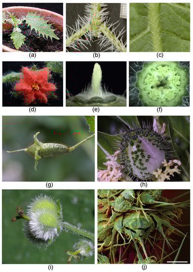 Stinging hairs are often found on all or most aerial parts of the plant, including the stem, the petioles and leaves, and the calyx (Figure 6a–c). The corolla and the internal flower parts usually lack stinging hairs, but in Loasaceae (e.g., Caiophora), the outsides of petals may be densely covered with stinging hairs, and there may be abundant stinging hairs in the inside of the flower and even inside the ovary (Figure 6d–f). Animal-dispersed fruits that are designed for endochorous dispersals, i.e., for consumption by animals, usually lack stinging hairs on their surface. The fleshy tepals covering the fruits of Urera and Dendrocnide (Urticaceae) are free of stinging hairs, but the inflorescence axes may be densely covered with stinging hairs. The dry fruits of Urtica tend to lack stinging hairs, but some species or varieties have stinging hairs on the tepals enclosing the achenes (Figure 6j). Conversely, the capsular fruits of Loasaceae and Wigandia and the explosive capsules of Cnidoscolus (active ejection of seeds), and generally the fruits of stinging species of Euphorbiaceae, are always particularly densely setose, evidently to discourage granivores and frugivores (Figure 6g–i).