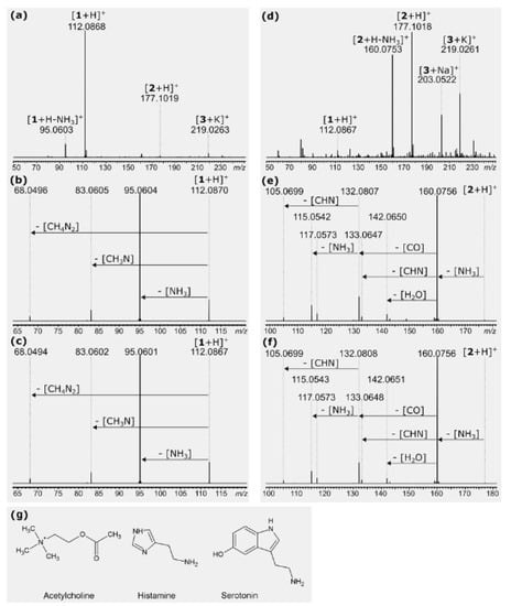 Nano-electrospray ionization mass spectra of stinging hair liquid of Loasa heterophylla (a–c) and Caiophora deserticola (d–f). Assignments: 1 = histamine, 2 = serotonin, 3 = a monosaccharide C6H12O6. (a,d) Overview spectra, with only the low-mass region shown. Substances are identified via accurate mass and higher energy collision-induced dissociation (HCD) of mass-selected ions. (b) Fragmentation of m/z 112 from (a) spectrum in comparison to (c) fragmentation of a reference sample of histamine. (e) Fragmentation of m/z 177 from (d) spectrum in comparison to (f) fragmentation of a reference sample of serotonin. (g) Structure formulas of the neurotransmitters acetylcholine, histamine, and serotonin.