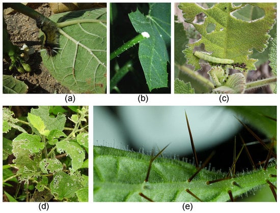 - Kariyat, R.R.; Smith, J.D.; Stephenson, A.G.; De Moraes, C.M.; Mescher, M.C. Non-glandular trichomes of Solanum carolinense deter feeding by Manduca sexta caterpillars and cause damage to the gut peritrophic matrix. Proc. R. Soc. B Biol. Sci. 2017, 284, 20162323. [Google Scholar] [CrossRef] [PubMed]