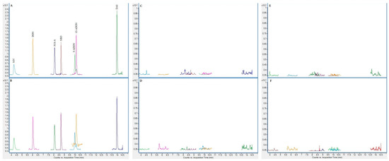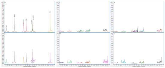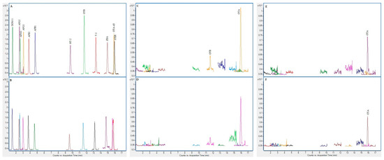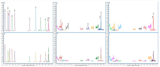 Superposed extracted chromatograms obtained for mycotoxin group II from a calibrator at 10× LOQ level (A,B) and plasma samples from a healthy child (PS37) (C,D) and a patient child (PD23) (E,F) after enzymatic treatment. (A,C,E) display the Q transition, and (B,D,F) the q transition, respectively.