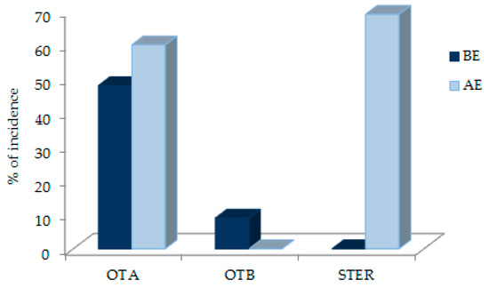 Global incidence (%) of each of the obtained mycotoxins (OTA, OTB, and STER) according to enzymatic treatment. AE: after enzymatic treatment. BE: before enzymatic treatment.