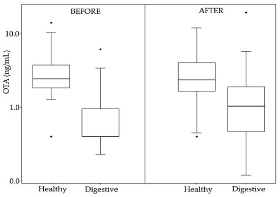 The mean OTA concentration in healthy subjects was much higher (3.21 ng/mL) (range <LOD–14.07 ng/mL) than that in children with digestive disorders 0.99 ng/mL (<LOD to 6.07 ng/mL) (Table 4). Significant differences were observed when comparing both groups using a Wilcoxon test (p < 0.05, 95% CI) (Supplementary Materials Table S2).
