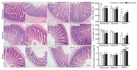 Effects of dietary mycotoxins and binders on histopathology of the duodenum, jejunum, and ileum (A) and morphology of the duodenum (B), jejunum (C), and ileum (D) of laying hens. Values are means ± SE, n = 10. Labeled means in a row without a common letter differ, P < 0.05. Control, basal diet; Toxins, basal diet supplemented with 0.15 mg/kg AFB1 + 1.5 mg/kg DON + 0.12 mg/kg OTA; Toxins + HP, basal diet supplemented with 0.15 mg/kg AFB1 + 1.5 mg/kg DON + 0.12 mg/kg OTA plus 0.29% TOXO HP; Toxins + XL, basal diet supplemented with 0.15 mg/kg AFB1 + 1.5 mg/kg DON + 0.12 mg/kg OTA plus 0.1% TOXO XL.