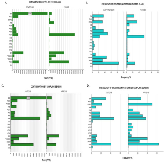 Taking a further look into contamination profiles by grouping the variables—feed class, sampling season, town, and province (agro-ecological zones) aids in elucidating any mycotoxin issues allowing patterns and possible links to be made for correlational studies with perception–behavioural analysis and exposure analysis for the purpose of regulation and monitoring. Because normality assumptions of parametric tests were not met for all assays, Kruskal–Wallis tests with normal approximation for k independent samples were used to evaluate possible differences in the mean (mean rank) mycotoxin levels across grouping variables. Statistical differences between groups of data were inferred at a significant level of α = 0.05. If significant differences between the groups were found, a Dunn post-hoc test at α = 0.05 with Bonferroni adjustment was used to evaluate the possible differences between incidences of each mycotoxin contamination within the different categories taking into account category means inclusive of all negative samples. Mycotoxin occurrence and distribution in animal feeds is influenced by a wide array of factors which include the nature of feeds (compound or forage), ingredient crop species (type and provenance), regional environmental conditions, season, farm management, amongst others. The effect of feed type and sampling season on mycotoxin detection (frequency and level) in feed samples investigated is presented in Figure 2 and Appendix A: Table A1, while variability (frequency and level) by province and by town is presented in Figure 3 and Appendix A: Table A2.