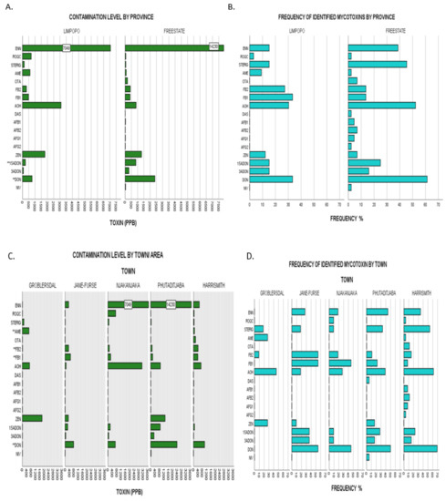 (A), Upper limit toxin concentrations for identified mycotoxins in overall dairy feeds from the two different provinces assessed: Limpopo vs Free State. Bars labelled with toxin name followed by a double Asterix (**) showed significant differences of mean ranks by Kruskal–Wallis test at p ≤ 0.05. (B), Frequencies of identified mycotoxins in same populations by province representative of agro-ecological zone. (C), Upper limit toxin concentrations for identified mycotoxins in overall dairy feeds from the five towns assessed: Groblersdal, Jane Furse, Njhakanjhaka, Phutaditjaba and Harrismith. Bars labelled with toxin name followed by a double Asterix (**) showed significant differences of mean ranks by Kruskal–Wallis test at p ≤ 0.05. (D), Frequencies of identified mycotoxins in same populations by town. Nivalenol (NIV), deoxynivalenol (DON), 3-acetyl deoxynivalenol (3-ADON), 15-acetyl deoxynivalenol (15-ADONs), zearalenone (ZEN), aflatoxin G2 (AFG2), aflatoxin G1 (AFG1), aflatoxin B2 (AFB2), aflatoxin B1 (AFB1), diacetoxyscirpenol (DAS), alternariol (AOH), fumonisin FB1 (FB1,) fumonisin FB2 (FB2), ochratoxin A (OTA), alternariol monomethyl ether (AME), sterigmatocystin (STERIG), roquefortine C (ROQ-C), enniatin B (ENN B).