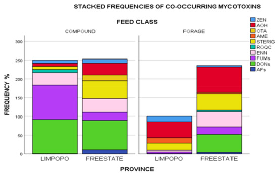 Forages from Limpopo, however, had overall lower frequencies of contamination with decreasing proportions of AOH + STERIG + AME + ZEN + FUMs + ENN B co-occurring. Free State forages showed higher frequency proportions with the co-occurrence profile dominated by AOH +DONs + STERIG+ ENN B and lower proportions of FUMS + AFs + ROQ C + AME+ ZEN. Co-contamination by FUMs + ZEN+ AOH + STERIG + ENN B was the only combination present across all grouping categories. The likelihood of simultaneous proliferation of several Fusarium species in feed ingredient plant material could in this instance explain the co-occurrence of FUMs, ZEN, and ENN B. Numerous inferences into species related additive, synergistic and antagonistic effects from co-occurrent combinations have widely been reported in literature [37,38,51], with concurrent occurrences of relevance even at significantly low levels, and exposure often meaning higher metabolic burden on the animal [39].