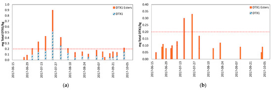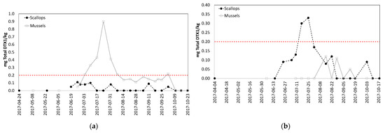 - Matsushima, R.; Uchida, H.; Watanabe, R.; Oikawa, H.; Oogida, I.; Kosaka, Y.; Kanamori, M.; Akamine, T.; Suzuki, T. Anatomical distribution of diarrhetic shellfish toxins (DSTs) in the Japanese scallop Patinopecten yessoensis and individual variability in scallops and Mytilus edulis mussels: Statistical considerations. Toxins 2018, 10, 395. [Google Scholar] [CrossRef]