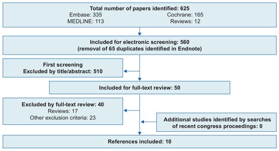 A total of 625 papers were identified in the electronic database searches; 65 duplicate papers were excluded before citation screening and 510 papers were excluded during citation screening (Figure 1). There were no relevant studies identified in the supplementary searches, and 40 of the remaining 50 papers were excluded during full-text review, leaving 10 studies (three observational studies [OSs] [21,22,23], five non-randomized controlled trials [24,25,26,27,28] and two studies reporting data from one randomized controlled trial [RCT] [29,30]) included in the SLR. In the included studies, sample size ranged from 10 to 383 patients, mean age was 32.8 to 55.9 years and percentage of female participants was 92.7% to 100% across six studies that reported gender. Three studies were conducted in Brazil [22,29,30], two in Lebanon [24,26], two in the USA [21,27] and one each in South Korea [25], Taiwan [28] and Thailand [23]. Six of the studies looked at aboBoNT-A injections in various parts of the middle and lower regions of the face for the treatment of various conditions, including lower eyelid wrinkles, nasal wrinkles, platysmal bands at rest and at maximal contraction and marionette lines [23,24,26,27,29,30]. Of the remaining four studies, two looked at patients that received injections in the masseter muscles [25,28], one looked only at treatments for excessive gingival display (gummy smile) [22] and one looked at injections in the platysma muscle only [21].