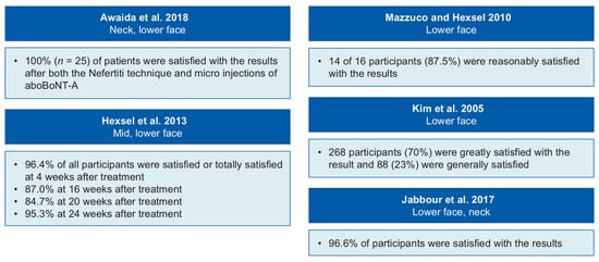 Six studies reported patients satisfaction outcomes [22,24,25,26,27,29] and one study assessed health-related quality of life (Supplementary Materials Table S1: Summary of patient satisfaction and quality of life outcomes) [29]. Most studies used simple surveys, asking the patient whether they were satisfied with their results. Only one study [27] used a formal assessment that has been evaluated elsewhere: the FACE-Q survey [33,35,36]. Five studies showed that 84–100% of participants were satisfied with the results of their treatment (Figure 3) [22,24,25,26,29]. In one study, the participants were 22.2% (p = 0.014) more satisfied with their overall facial appearance at day 14 compared with baseline [27]. In one study that used two techniques, 72% of patients preferred micro injections, 20% preferred the Nefertiti technique and 8% had no preference [26]. In the study that assessed quality of life, which used the World Health Organization Quality of Life—Brief Version questionnaire (WHOQOL-BREF), there was a significant improvement in the physical quality of life domain between baseline and 4 weeks. When comparing total dose groups, a medium dose group (166–205 U) had significantly better physical, psychological and social relationships quality of life scores than the low (120–165 U) and high (206–250 U) dose groups [29].