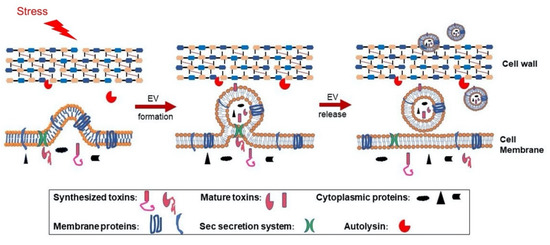S. aureus EV formation is common among S. aureus strains, including antibiotic-resistant isolates, and much information about their biological activities has been revealed during the past decade [19,20,21,22,23,24]. Staphylococcal EVs package a diverse array of components, including cytosolic, surface, and membrane proteins, as well as surface adhesins, lipoproteins, and toxins [19,20,21,24]. Staphylococcal products secreted as soluble molecules in vivo can interact with host cells, but they may be subject to destruction by proteases or antibody neutralization. Because S. aureus EVs can be endocytosed within host cells [27], EVs may serve as a novel secretory system for S. aureus to effectively transport toxins and other EV cargo to intracellular compartments. The fate of EV cargo upon internalization, however, still remains to be elucidated.