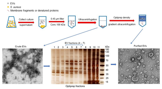 We purified EVs from the culture supernatants of S. aureus JE2 [24], a USA300 strain that represents the major community-acquired methicillin-resistant clone in the United States. The EVs were harvested by concentrating filter-sterilized culture supernatants to remove molecules <100 kDa (Figure 2). Following ultracentrifugation, the pelleted crude EVs were purified from protein aggregates, membrane fragments, and other debris by Optiprep-based density gradient ultracentrifugation. Aliquots of Optiprep fractions were subjected to SDS-PAGE following by silver staining. Samples with similar protein banding patterns were pooled, subjected to diafiltration, and examined by transmission electron microscopy. EVs were distributed in fractions containing 20−35% Optiprep (Figure 2).