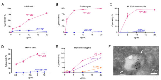 The expression of many of the S. aureus PFTs and secreted enzymes is regulated by products of the accessory gene regulator (agr) operon [50]. The relative toxicity of EVs prepared from wild-type (WT) strain JE2 and JE2∆agr was assessed by incubating EVs in vitro with different cell types. JE2 EVs were toxic for A549 human epithelial cells at doses as low as 1 µg/mL, whereas EVs from JE2∆agr exhibited negligible toxicity (Figure 3A). Consistent with the fact that rabbit erythrocytes are susceptible to Hla, PSMs, and the leukocidins HlgAB and LukED [51,52,53], JE2 EVs exhibited hemolytic activity, whereas treatment with EVs from JE2∆agr resulted in no hemolysis (Figure 3B). HL60 neutrophils are susceptible to cytolysis induced by S. aureus leukocidins (including HlgAB, HlgCB, PVL-SF, LukED, and LukAB) and PSMs. As predicted, JE2 EVs, but not EVs from JE2∆agr, were cytolytic for HL60 cells (Figure 3C). Similarly, human macrophages are susceptible to Hla, PSMs, and leukocidins (including PVL-SF, LukED, LukAB, HlgAB, and HlgCB). JE2 EVs were toxic for differentiated THP-1 macrophages, whereas EVs from JE2∆agr∆sae showed negligible cytotoxicity (Figure 3D).