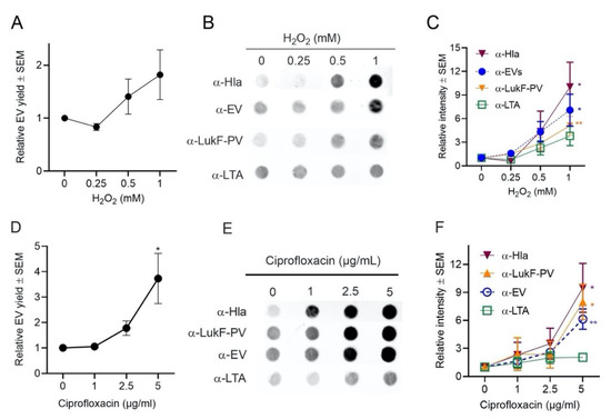 Similarly, when S. aureus was grown in subinhibitory concentrations of ciprofloxacin (Figure S3B), protein quantification assays (Figure 5D) and dot immunoblot analyses (Figure 5E) showed that the production of EVs was increased compared to cultures lacking ciprofloxacin. EV immunoblots probed with antibodies to Hla, LukF-PV, or EVs showed a dose-dependent increase in signal, but there was only a minimal increase when immunoblots were probed with LTA antibodies (Figure 5F). Lotz et al. reported that treatment with a low concentration of ciprofloxacin resulted in LTA release by S. aureus cells [59]. Whether this accounts for the minimal signal observed when EVs were probed with LTA antibodies merits further investigation. In contrast, protein quantification assays and dot blot analyses showed that the production of EVs was decreased when S. aureus JE2 was grown in a subinhibitory concentration (0.05 µg/mL) of erythromycin (Figure S4), a bacteriostatic antibiotic that inhibits protein synthesis.