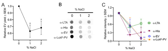 The presence of high salt in the environment, food, or on human skin can generate osmotic stress on S. aureus cells, resulting in water loss, low turgor pressure, and cell shrinkage [56]. To evaluate the effect of osmotic stress on EV production, S. aureus was grown in TSB medium supplemented with 1% or 2% NaCl. Although the added salt only showed a minimal effect on S. aureus growth (Figure S3D), EV protein yield was significantly reduced under high salt conditions (Figure 7A). Likewise, dot immunoblot analysis of EV preparations with antibodies to EVs, LukF-PV, or Hla showed reduced signals in samples cultivated in TSB + NaCl (Figure 7B,C). The reduction in signal was less apparent with antibodies to LTA (Figure 7C), suggesting that the LTA content of EVs was somewhat enriched compared to that of the other antigens. Kho and Meredith reported that the LTA component of the cell wall has been shown to be important in withstanding salt-induced osmotic stress [65].