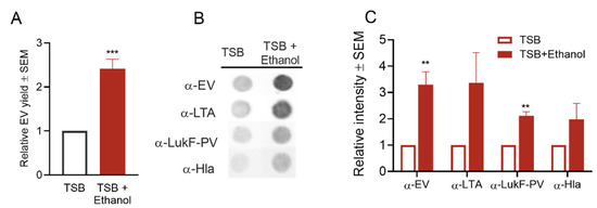 Ethanol, widely used in the disinfection of skin and medical devices in the healthcare environment, causes disruption of membrane structures [66] and interferes with cell division [67]. Although high concentrations of ethanol are used in disinfection, residual ethanol left on surfaces may be low due to evaporation or dilution. Low concentrations of ethanol can exert envelope stress on S. aureus, as shown by altered gene expression profiles [41]. To address the effect of ethanol on EV production, we cultivated S. aureus in TSB + 1% ethanol. Although the bacterial growth rate was not affected (Figure S3E), EV yield was significantly enhanced in the presence of ethanol (Figure 8A). Similarly, dot blot analysis of EV preparations with antibodies to EVs, LTA, LukF, and Hla showed increased signals (Figure 8B,C), confirming the positive effect of ethanol stress on EV generation.