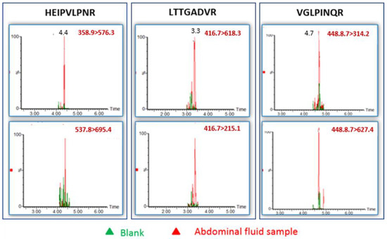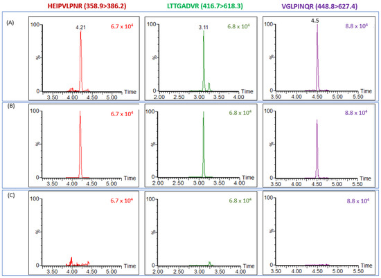 Assay validation in serum samples. LC–MS/MS (MRM) chromatograms of different samples: (A) Typical serum sample spiked with ricin (5 ng/mL). (B) Positive control: PBS spiked with ricin (5 ng/mL). (C) Negative control: naive serum. Each chromatogram represents the higher marker’s intensity of MRM transition.