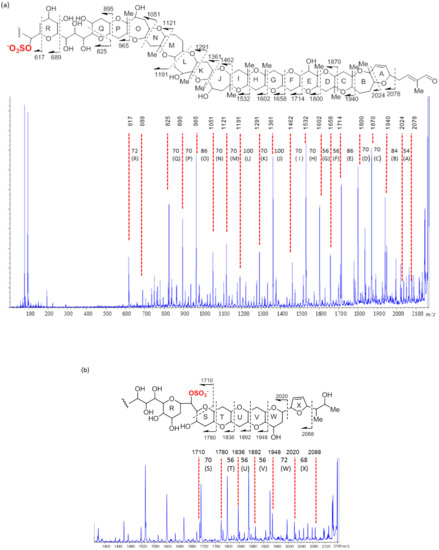 However, the 1H and 13C chemical shifts corresponding to the CH-71 region differed significantly. The ΔδH (δH-KBTG−δH-KBTA2) and ΔδC (δC-KBTG−δC-KBTA2) values in the vicinity of CH-71 are summarized in Table 2. The 1H chemical shift of H-71 shifted downfield from δH 5.05 in KBT-G to δH 5.70 in KBT-A2, thus ΔδH of H-71 was −0.65. Similarly, the 13C chemical shift of C-71 shifted downfield from δC 67.1 in KBT-G to δC 73.3 in KBT-A2, thus ΔδC of C-71 was −6.2. The ΔδH and ΔδC of CH-71 were greater than those of the remaining protons and carbons in that region. In addition, in the 1H NMR spectrum of KBT-G, proton coupling between H-71 and a hydroxy proton was observed, while this was not the case for KBT-A2, due to the substitution of OH with OSO3Na. Therefore, it was deduced that the sulfate ester was bonded to C-71 (Figure 1).
