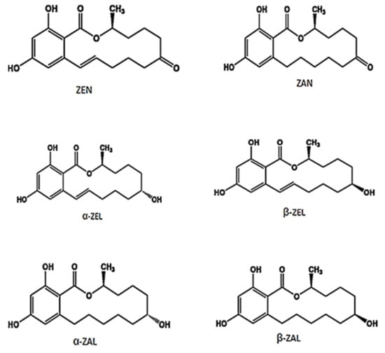 The metabolism of ZEN is poorly understood in humans [26], however, studies in animal model suggest that ZEN is metabolized primarily to α-zearalenol (α-ZEL) and β-zearalenol (β-ZEL) [27,28] and the ratio of their concentrations is dependent on the type of animal species. It is further reported that α-ZEL and β-ZEL may reduce to α-zearalanol (α-ZAL) and β-zearalanol (β-ZAL) [29,30]. α-ZAL is metabolized predominantly into β-ZAL and, to a lesser extent, into zearalanone (ZAN) [31]. The chemical structure of ZEN and its different metabolites are presented in Figure 1.