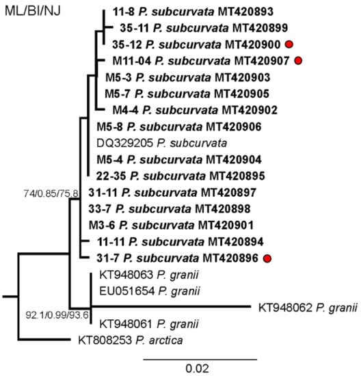 Phylogenetic analysis based on maximum likelihood (ML) of the strains of P. subcurvata included in this study. Numbers at nodes represent the bootstrap values of an ML analysis with 1000 replicates/posterior probability of Bayesian inference (BI) analysis/bootstrap values of neighbour-joining (NJ) out of 10,000 replicates. The scale bar corresponds to two substitutions per 100 nucleotide positions.