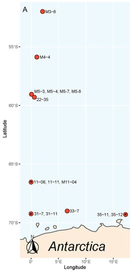 Water samples and physiochemical parameters were collected with a conductivity, temperature, depth sampler (CTD) at depths of 10–15 m (Supplementary Table S1). The samples were collected between 51.99° S as the most northern and 69.3° S as the southern locality. Strains were isolated from water sampled at different localities (Figure 2, Supplementary Table S1) close to the Antarctic mainland. Monoclonal strains were established by isolation of single cells or chains. Strains were cultured in 55 mL flasks in L1 medium with salinity 30 at 4 °C and 120-µmol photons m−2 s−1 cool white light.
