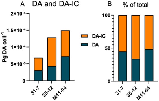 (A) Domoic acid (DA) and iso-domoic acid C (DA-IC) profiles of the three toxic strains, absolute amounts. (B) Relative amounts of DA and DA-IC of the three toxic strains.
