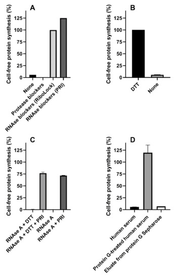 - Confirm the absence of inhibition by determining the effect on protein synthesis of the protein G-treated patient’s serum sample with respect to a pool of protein G-treated sera from healthy donors (at least 3) by the cell-free translation system described in the paper in the presence and in the absence of DTT.