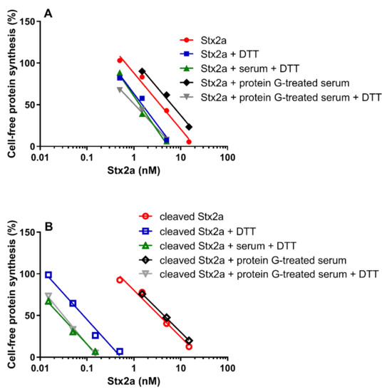 Effect of Stx2a on cell-free protein synthesis under reducing and non-reducing conditions. The experiments were performed in the presence of mixed sera from three healthy donors (untreated or treated with protein G Sepharose). When serum was present, PRI was added. (A) Uncleaved form of Stx2a; (B) Cleaved form of Stx2a. The IC50 values calculated from the straight lines depicted above are reported in Table 1 and Table 2. Mathematical and statistical details are reported in Supplementary Materials Table S1.