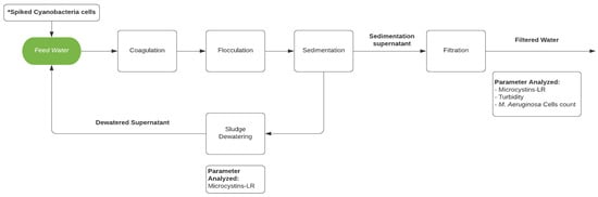 Cyanobacterial blooms and the associated release of cyanotoxins pose problems for many conventional water treatment plants due to their limited removal by typical unit operations. In this study, a conventional water treatment process consisting of coagulation, flocculation, sedimentation, filtration, and sludge dewatering was assessed in lab-scale experiments to measure the removal of microcystin-LR and Microcystis aeruginosa cells using liquid chromatography with mass spectrometer (LC-MS) and a hemacytometer, respectively. The overall goal was to determine the effect of recycling cyanotoxin-laden dewatered sludge supernatant on treated water quality. The lab-scale experimental system was able to maintain the effluent water quality below relevant the United States Environmental Protection Agency (US EPA) and World Health Organisation (WHO) standards for every parameter analyzed at influent concentrations of M. aeruginosa above 106 cells/mL. However, substantial increases of 0.171 NTU (Nephelometric Turbidity Unit), 7 × 104 cells/L, and 0.26 µg/L in turbidity, cyanobacteria cell counts, and microcystin-LR concentration were observed at the time of dewatered supernatant injection. Microcystin-LR concentrations of 1.55 µg/L and 0.25 µg/L were still observed in the dewatering process over 24 and 48 h, respectively, after the initial addition of M. aeruginosa cells, suggesting the possibility that a single cyanobacterial bloom may affect the filtered water quality long after the bloom has dissipated when sludge supernatant recycling is practiced.