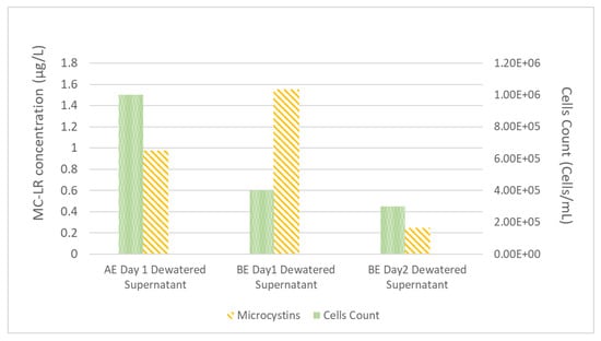 Data shown in Figure 2 follow the same trend as the data shown in Table 2 with higher MC-LR and lower cell counts for experiment B than experiment A. The MC-LR concentrations of dewatered supernatant for experiments AE and BE (Figure 2) are higher than the feed water MC-LR concentrations (Table 2), this result highlights the potential for M. aeruginosa cells to be lysed during the coagulation and flocculation process and also during the dewatering process.