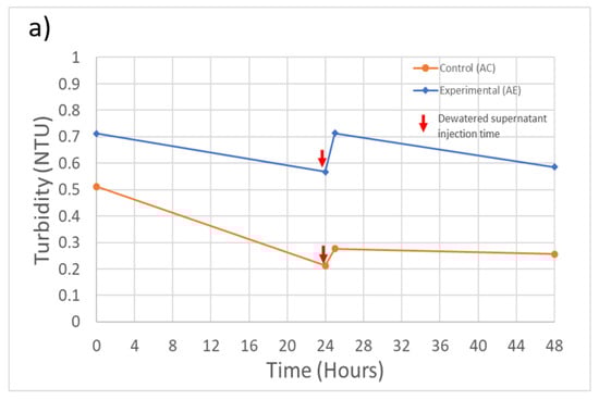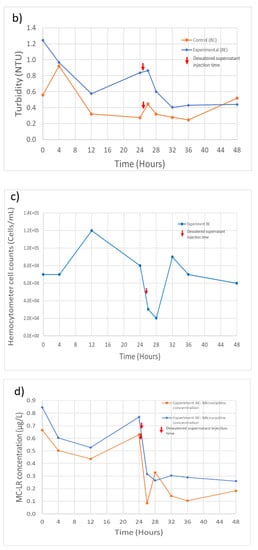 M. aeruginosa cell counts for the filtration process effluent in experiment B are shown in Figure 3c (effluent cell counts are not available for experiment A). The treatment process in experiment B was able to remove 95.8% of the initial 1.6 × 106 cells/mL (Table 2). An increase in the cell counts following injection of dewatered supernatant can also be observed, but the timing of the increase is delayed in comparison with the time of the turbidity increase. The cause of this difference in timing is not clear, but it could mean that the prior turbidity increase may not be solely due to the influence of the injected M. aeruginosa cells.