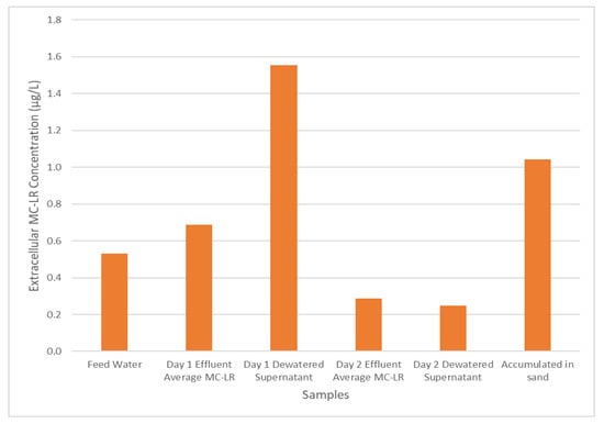 The MC-LR originally retained primarily in an intracellular form are now able to move through the process and enter the filtration process. However, as mentioned previously, the filtration process exhibits relatively low removal of extracellular MC-LR, resulting in its release in the filtrate solution. Further, examining the MC-LR concentration in day 2 dewatered supernatant at the end of the operation, it can be seen that MC-LR remains in the supernatant waiting to be recycled back into the system during the next operation period along with the MC-LR accumulated in the sand media for the previous 48 h of operation time. The retained MC-LR could be released from the filter media during the backwashing operations. Thus, even for a cyanobacterial bloom that affected feed water for only 24 h, the effects of the toxins and cyanobacteria from the bloom may persist much longer than one treatment system residence time if the plant recycles dewatered supernatant and/or the filter media backwash water.