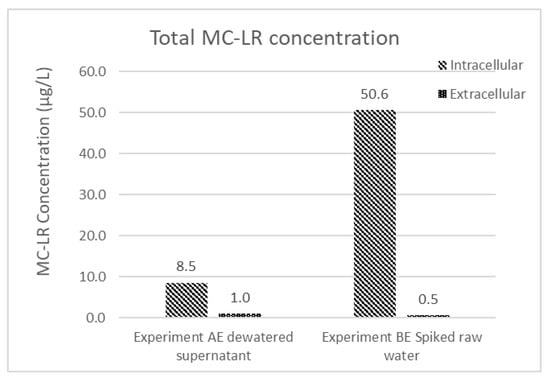 Extracellular and intracellular MC-LR concentration of experiment AE dewatered supernatant and experiment BE spiked raw water.