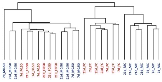 Hierarchical clustering analysis of kidney samples from male and female rats (M, in blue; F, in red). They were treated for 7 or 21 days (7d; 21d) with 0.50 mg OTA/kg b.w. (0.50) or with the vehicle (NaHCO3) (C). OTA, ochratoxin A; b.w., body weight.