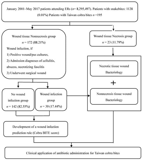 Taiwan, a subtropical island, has many types of snakes; of these, six species of venomous snakes are considered clinically important: Naja atra (Taiwan cobra or Chinese cobra), Bungarus multicinctus, Protobothrops mucrosquamatus (Taiwan habu), Trimeresurus stejnegeri (green bamboo viper), Deinagkistrodon acutus (hundred pacer viper), and Daboia siamensis (eastern Russell’s viper). Among these, N. atra are responsible for approximately 20% of venomous snakebites in Taiwan [1]. While other species of cobra cause neurological complications, Taiwan cobra bites do not; however, they cause wound tissue damage/necrosis due to the actions of cytotoxins in the venom, and confer a high risk of wound infection [2,3,4]. To our knowledge, there are no clinical parameters that can predict or assesses the clinical severity of the cobra bites patients. Although some studies have investigated the bacteriology of cobra bite wounds [5,6], guidelines for differentiating patients based on whether they have wound infections are lacking. Wound necrosis is a common complication associated with cobra bites [2], and affected patients may be treated with antibiotics. Knowledge on whether nonnecrotic cobra wounds are infected is important. Furthermore, to provide appropriate antibiotics to patients with wound infections, wound bacteriology must be investigated. This study investigated the wound bacteriology of necrosis wounds and infected wounds without necrosis to develop a clinically useful wound infection prediction rule (Cobra Bites/Bacteriology of Infections in Taiwanese snake Envenomation (Cobra BITE) study) to guide antibiotic use (Figure 1).