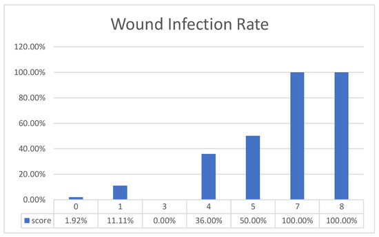 Cobra BITE scores and wound infection rates. Cobra BITE scores and wound infection rates. The higher the score was, the higher the wound infection rate. With an optimal cutoff point of 7, the sensitivity and specificity of Cobra BITE score were 0.89 and 0.76, respectively.