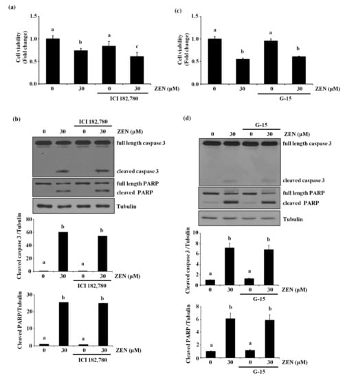 Estrogen receptors do not mediate ECs apoptosis by ZEN. After pretreatment with (a,b) 10 µM of ICI 182,780 or (c,d) 1 µM of G-15 for 1 h, BAECs were incubated with 30 µM of ZEN for 24 h. (a,c) Cell viability was measured using the MTT assay. (b,d) The protein expression of cleaved caspase 3 and PARP relative to tubulin was quantified using western blot analyses. The plots depict the mean fold changes relative to the control (±SD) from at least four independent experimental trials. The different alphabetical letters refer to significant differences (p < 0.05) among groups, which were determined by one-way ANOVA followed by Tukey’s multiple comparisons.